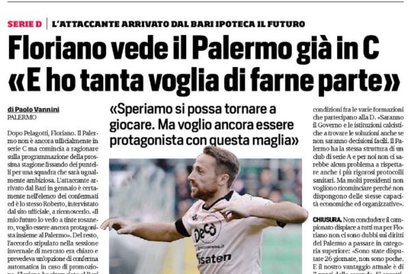L'edizione odierna del "Corriere dello Sport" riporta le dichiarazioni di Roberto Floriano, attaccante del Palermo, ai microfoni del sito ufficiale...