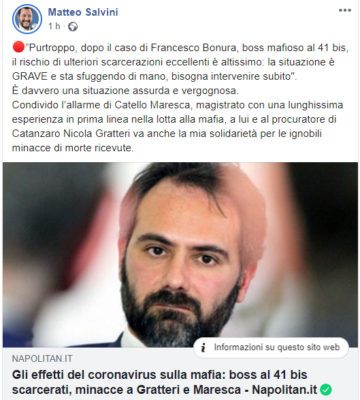 "Purtroppo, dopo il caso di Francesco Bonura, boss mafioso al 41 bis, il rischio di ulteriori scarcerazioni eccellenti è altissimo:...