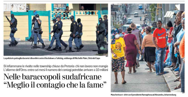 L'edizione odierna de "La Stampa" si sofferma sulla situazione mondiale dell'emergenza Coronavirus. In Sudafrica preferiscono essere contagiati, piuttosto che morire...