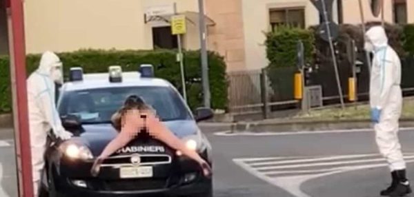 Una donna praticamente nuda si è sdraiata sul cofano dell'auto dei carabinieri e ora si trova in ospedale e la...