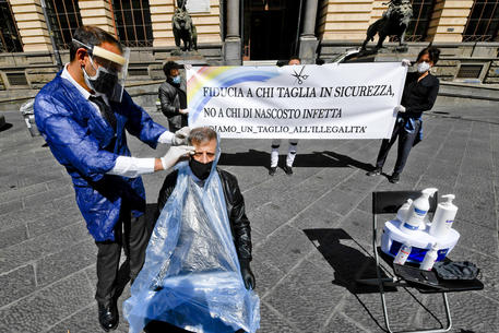 Taglio di capelli in piazza oggi a Napoli per sollecitare una rapida apertura, dopo il lockdown del Coronavirus, di barbieri...