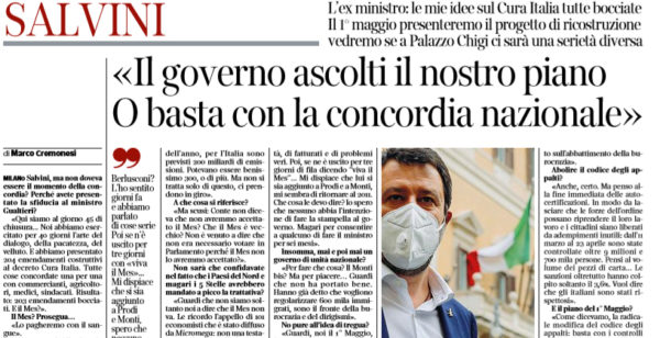 L'edizione odierna del "Corriere della Sera" riporta le dichiarazioni di Matteo Salvini, leader della Lega: "Le mie idee sul Cura...