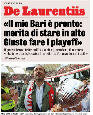 L'edizione odierna della "Gazzetta dello Sport" riporta le dichiarazioni di Luigi De Laurentiis, presidente del Bari: «Difficile sbrogliare la matassa. E'...