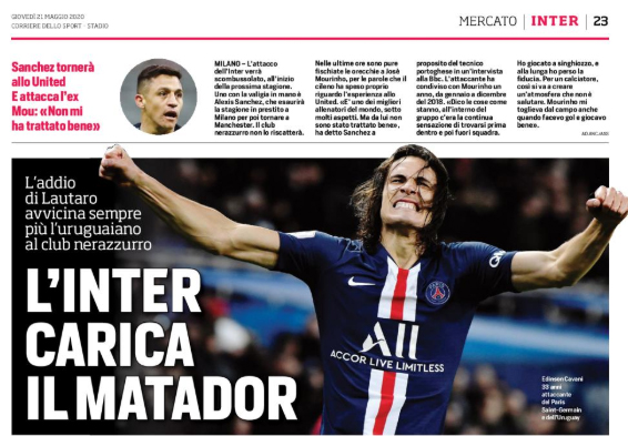 L'edizione odierna de "Il Corriere dello Sport" ha riportato le ultime in merito al futuro di Edinson Cavani. Con l'Inter...