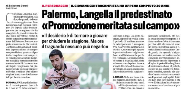 L'edizione odierna del "Corriere dello Sport" riporta le dichiarazioni di Christian Langella, centrocampista del Palermo, rilasciate ai microfoni del sito...