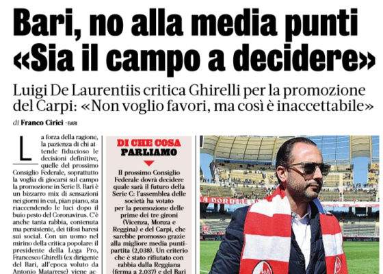 L'edizione odierna della "Gazzetta dello Sport" si sofferma sulla protesta del Bari nei confronti del criterio della media punti per...