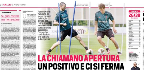 L'edizione odierna del "Corriere della Sera" si sofferma sulla ripartenza del calcio. Il semaforo è giallo lampeggiante. Il comitato tecnico-scientifico...