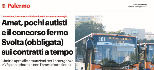 L'edizione odierna del "Giornale di Sicilia" parla dei trasporti in Sicilia, rivoluzionati per le misure anti-contagio. L'Amat pensa a contratti...