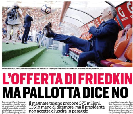 L'edizione odierna del Corriere dello sport si concentra sui nuovi sviluppi della trattativa tra Il magnate texano Friedkin e James...