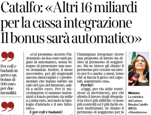 L'edizioni odierna del "Corriere della Sera" si è soffermata sulle dichiarazioni della Ministra Catalfo, intervenuta in merito al reddito di...