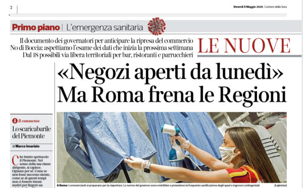 L'edizione odierna del "Corriere della Sera" si sofferma sullo scontro Governo-Regioni sulla riapertura degli esercizi commerciali. I governatori hanno messo...