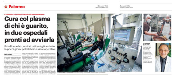 L'edizione odierna del "Giornale di Sicilia" si sofferma sulla sperimentazione del plasma di chi è guarito al Policlinico di Palermo...