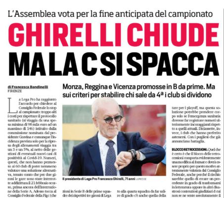 L'edizione odierna del "Corriere dello Sport" si sofferma sulla decisione della Lega Pro di chiudere definitivamente il campionato di C....