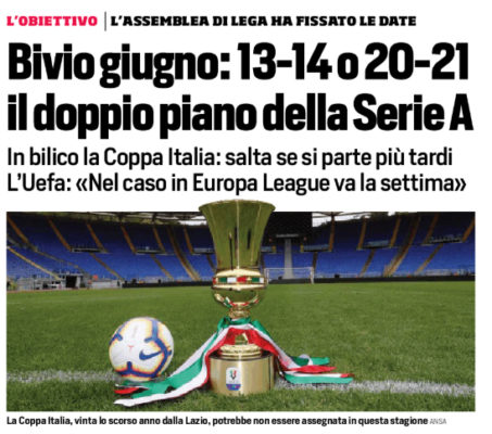 L'edizione odierna del "Corriere dello Sport" si sofferma sull'ipotesi che vedrebbe la ripresa della Serie A. Il primo scenario vedrebbe...