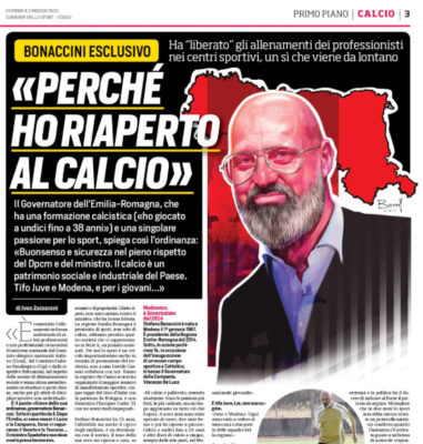 Corriere dello Sport: “Bonaccini: “Perché ho riaperto al calcio”