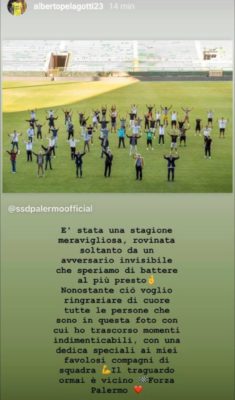 Alberto Pelagotti, portiere del Palermo, ha voluto ringraziare tutti sul suo profilo Instagram tramite una storia. In alto il messaggio...