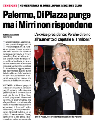 L'edizione odierna del "Corriere dello Sport" si sofferma sull'attacco di Di Piazza alla famiglia Mirri, relativamente all'immissione dell'intero capitale sociale....