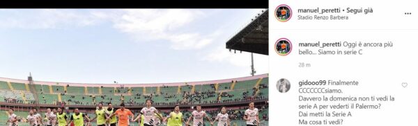 Il giovane difensore rosanero Manuel Peretti esulta dopo la conferma della promozione del Palermo in Serie C e sui social...