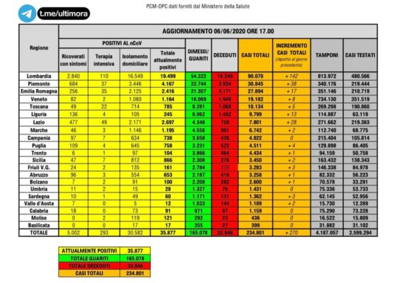 La Protezione Civile ha reso noto il bilancio dei contagi da Coronavirus aggiornato a sabato 6 giugno 2020. Rispetto alla...