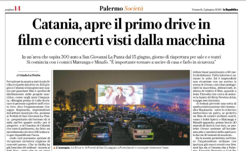 L'edizione odierna de "La Repubblica" si sofferma sull'apertura del primo drive in a Catania a partire dal 15 giugno. Si...