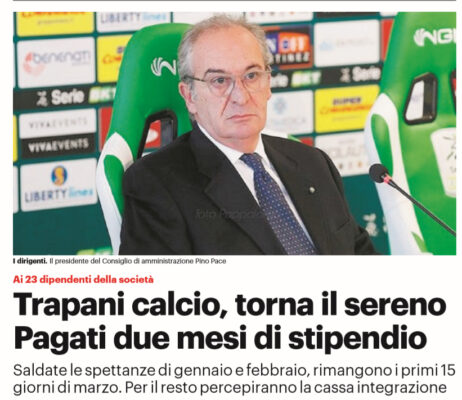 L'edizione odierna del "Giornale di Sicilia" si sofferma sulla delicata situazione del Trapani. I 23 dipendenti hanno ricevuto il bonifico...