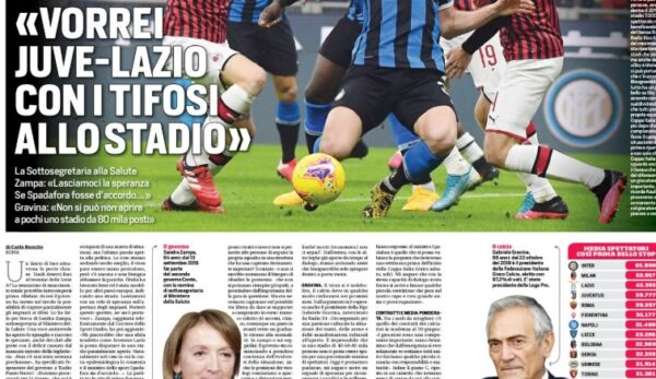 L'edizione odierna del "Corriere dello Sport" si sofferma sulla possibilità di disputare Juventus-Lazio con la presenza dei tifosi. Sandra Zampa,...