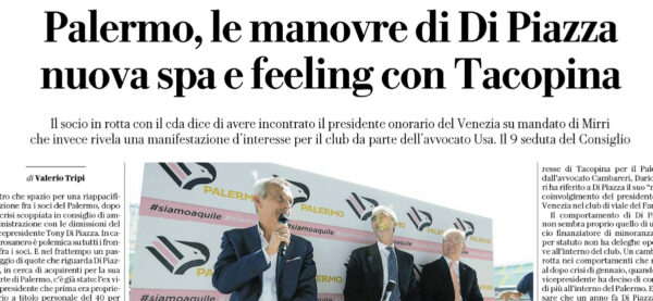 L'edizione odierna de "La Repubblica" si sofferma sui rapporti tra Di Piazza e Tacopina. L'ex vicepresidente rosanero ha negato di...