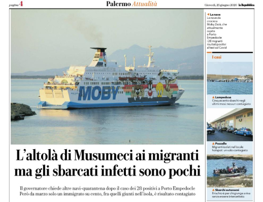 L'edizione odierna di "Repubblica" parla dei 26 migranti positivi al Covid-19 sulla nave quarantena Moby Zazà. Il presidente della Regione...