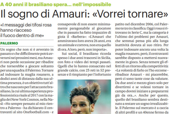 L'edizione odierna del "Giornale di Sicilia" parla del sogno di Amauri, che vorrebbe tornare a vestire la maglia del Palermo...