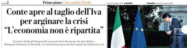 L'edizione odierna di "Repubblica" riporta le parole del Premier Conte dopo gli stati generali. «Dovremo intervenire per un nuovo scostamento...