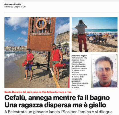 L'edizione odierna del "Giornale di Sicilia" parla della tragedia di ieri a Cefalù. Le onde hanno inghiottito Santo Durante, 55anni,...