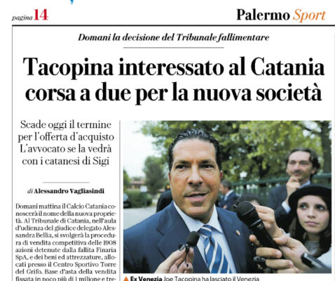 L'edizione odierna di "Repubblica" parla della questione Catania. Domani mattina sarà indicato il nome della nuova proprietà. Al Tribunale di...