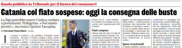 L'edizione odierna della "Gazzetta dello Sport" parla della questione Catania. Stamane saranno consegnate in Tribunale le candidature per l’acquisto del...