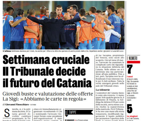 L'edizione odierna della "Gazzetta dello Sport", parla di settimana decisiva per le sorti del Catania. Giovedì, il club etneo potrebbe...