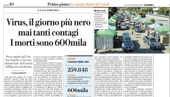 L'edizione odierna di "Repubblica" parla della situazione Coronavirus. Proprio ieri i contagi hanno infatti toccato un altro tragico record: 259.848...