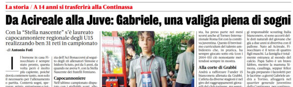 Gazzetta dello Sport: “La storia. A 14 anni si trasferirà alla Continassa. Da Acireale alla Juve: Gabriele, una valigia piena di sogni”