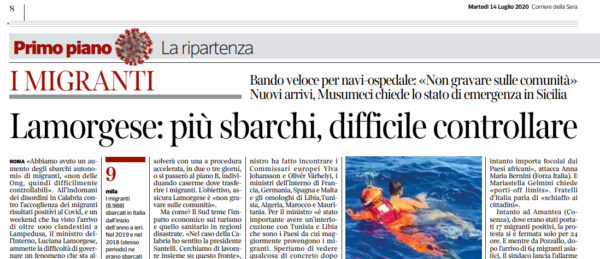 Corriere della Sera: “Nuovi arrivi, Musumeci chiede lo stato di emergenza in Sicilia. Lamorgese: «Più sbarchi, difficile controllare»”