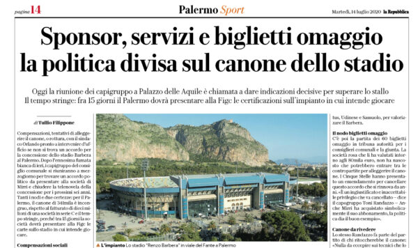 Repubblica: “Sponsor, servizi e biglietti omaggio, la politica divisa sul canone dello stadio Renzo Barbera”