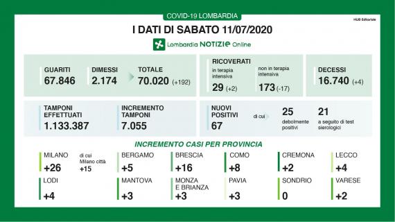 La Regione Lombardia ha effettuato 7.055 nuovi tamponi e individuato 67 nuovi positivi al Coronavirus nelle ultime 24 ore. 192...