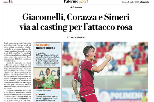 L'edizione odierna de "La Repubblica" si sofferma sul calciomercato del Palermo. Sul fronte offensivo piacciono Giacomelli del Vicenza, Corazza della...