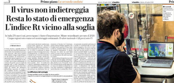L'edizione odierna de "La Repubblica" si sofferma sull'emergenza Coronavirus in Italia. Cinque regioni hanno un Rt q 14 giorni superiore...
