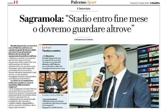 L'edizione odierna di "Repubblica" riporta un'intervista realizzata all'amministratore delegato del Palermo Rinaldo Sagramola. Come si vince la serie C? «Intanto...
