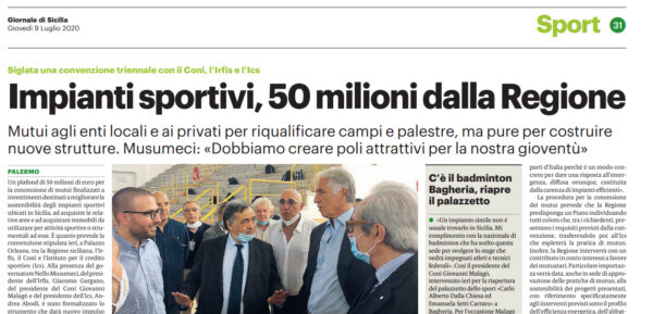 Gds: “Sicilia. Siglata una convenzione triennale con il Coni, l’Irfis e l’Ics. Impianti sportivi, 50 milioni dalla Regione”