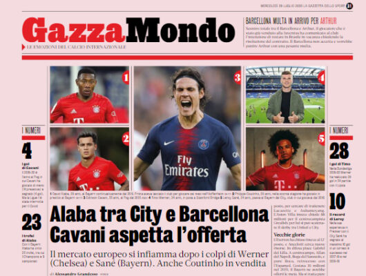 L'edizione odierna della "Gazzetta dello Sport" dedica spazio anche al mercato europeo. Cavani, svincolato dal Psg, cerca a 33 anni...