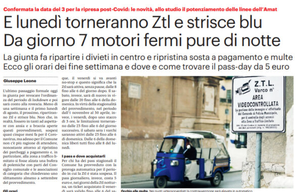 L'edizione odierna del "Giornale di Sicilia" parla del ritorno della ZTL e delle strisce blu a Palermo. L’ultimo passaggio formale...