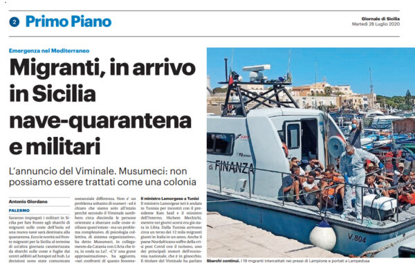 L'edizione odierna del "Giornale di Sicilia" parla dell'arrivo in Sicilia della nave-quarantena e dei militari per far fronte agli sbarchi....