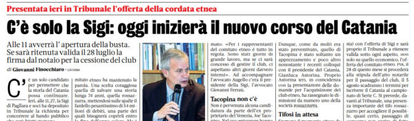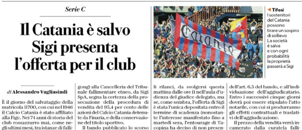 L'edizione odierna di "Repubblica" parla del salvataggio della matricola 11700 del Catania. L’offerta di Sigi è stata l’unica depositata entro...