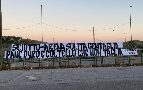 Nuovo striscione esposto dai "Testi Fracidi", gruppo ultras di Messina che negli ultimi giorni sta attaccando le due società messinesi....