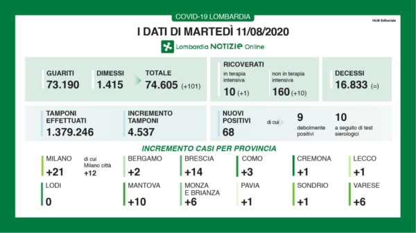 Salgono rispetto a ieri i casi di Coronavirus in Lombardia. Oggi si registrano +68 casi (9 debolmente positivi e 10...