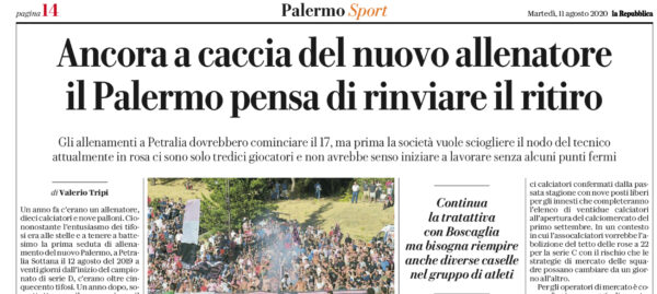 L'edizione odierna de "La Repubblica" si sofferma sul Palermo. Potrebbe slittare l'inizio del ritiro. Al momento, senza un allenatore e...